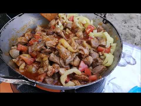 A megdinsztelődött hagymához adjuk a húst és kevergetve addig sütjük,amig minden oldala fehér lesz.