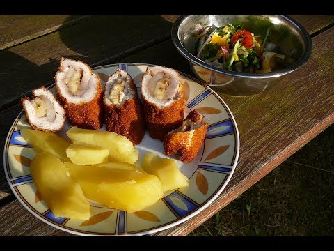 A banánokat hosszában elfelezzük. A szalonnából csíkokat vágunk. A húsra középen ráfektetjük a banánt,majd rá a szalonnát és felgöngyöljük. Fogpiszkálóval összetűzzük. Ezután lisztbe, tojásba végül prézlibe mártva bepanírozzuk. Bő, forró olajban kisütjük. Lecsepegtetjük és széles, ferde szeleteket vágva belőle, sült krumplival,salátával tálaljuk.