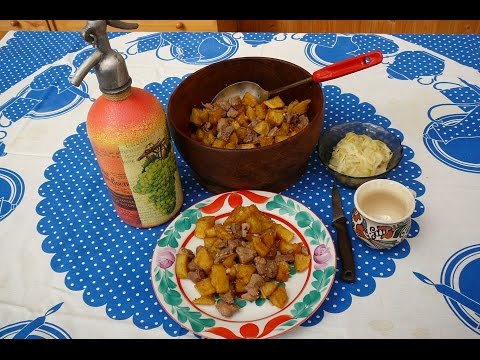 Felkockázzuk a húst és zsíron lesütjük. Sózzuk,borsozzuk és annyi vízzel felengedjük,ami éppen ellepi.Ezzel fedő alatt főzzük. Többször megkeverjük, ha kell pótoljuk az elfőtt vizet. Amikor már puha, levesszük a fedőt,meghintjük a liszttel. Jól elkeverjük és hozzáadjuk a kinyomott fokhagymát és a majorannát. Zsírjára sütjük. Közben forró olajban kisütjük a félig megfőtt és lecsepegtetett burgonyát. Amikor pirosra sűlt, hozzáadjuk a húshoz. Összekeverjük és savanyúsággal tálaljuk.