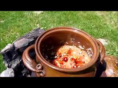 Hozzáadjuk a húshoz. Belekeverjük a cseresznyepaprikát és a gombaport is. Felöntjük annyi vízzel,ami ellepi. Néhányszor megkeverve,fedő altt fél órát főzzük. Ekkor a babot is hozzáadjuk. Addig főzzük,amig a bab puha nem lesz. Kostolás után fűszerezhetjük még. Kb. három óra alatt fől meg a bab, a cserépedényben,szabadtűzön. Puha kenyérrel tálaljuk.
