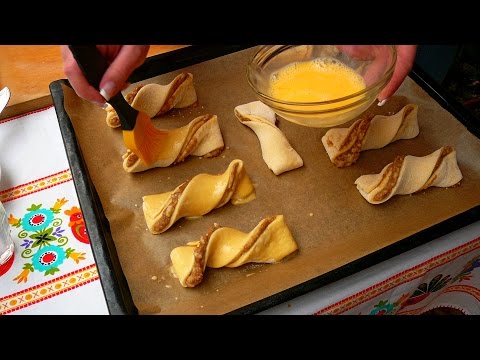 Amikor megkelt a tészta, a deszkánkat meglisztezzük, és fél cm vastagra kinyújtjuk a tésztát. Elkenjük az almát a tetején. Három részben összehajtjuk. Alulról középre, majd felülről középre. Ezután,kb 2-3 ujjnyi csíkokat vágunk a tésztából. Kettőt csavarunk a két végén ellentétes irányban. Sütőpapírral bélelt tepsibe tesszük. A tojást a tejjel kikeverjük és ezzel megkenjük a tetejét. Előmelegített sütőben 180 fokon 15 percig sütjük. Amikor piros a teteje készen van. Tálaláskor porcukorral meghintjük.