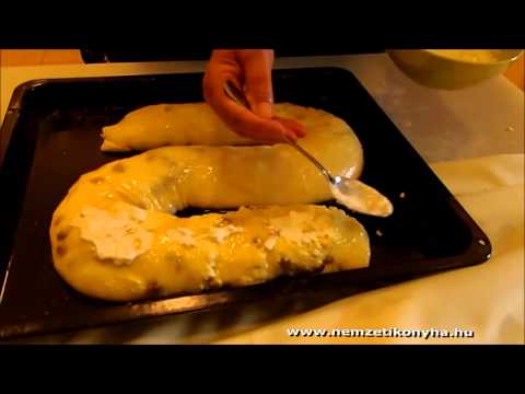 Meglocsoljuk olajjal, majd a túró tölteléket szétoszlatjuk rajta. Meghintjük cukorral, a vízben áztatott mazsolával és végül pár kanál tejfölt teszünk rá. A terítő segítségével a négy szélét felhajtjuk, meglocsoljuk olajjal a felhajtást és az egészet feltekerjük.
