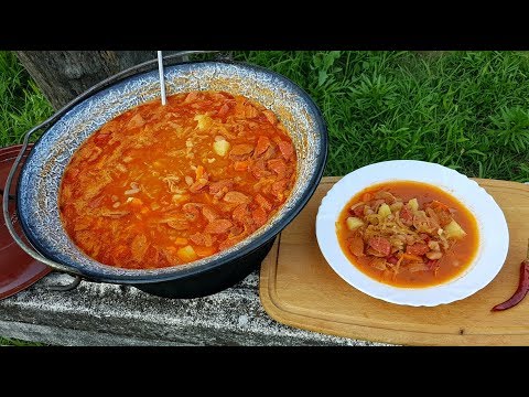 Amikor félig puhára megfőtt a bab, leöntjük a főző levével együtt egy másik edénybe. A bográcsot szárazra töröljük és a felkockázott szalonnát kisütjük. A vöröshagymát megdinszteljük benne és rászórjuk a fele sót és a pirospaprikát. Hozzáadjuk a sárgarépát, amit picit pirítunk benne. Ekkor beletehetjük a kisebbre aprított és jól kimosott, kicsavart savanyúkáposztát. Összekeverjük és felöntjük annyi lével, ami nem engedi, hogy leégjen. Fedő alatt főzzük.