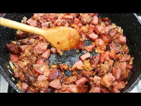 Hozzáadjuk a kolbászt és összesütjük őket.