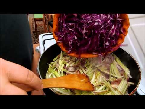 Közben megpucoljuk és felszeleteljük a lilahagymát és a lilakáposztát. Fontos,hogy mindkettőt vékonyra szeleteljük. Pici sóval beszórjuk és állni hagyjuk. Felszeleteljük a póréhagymát 4-5 cm-es darabokat hosszában. A gyömbért meghámozzuk és lereszeljük.