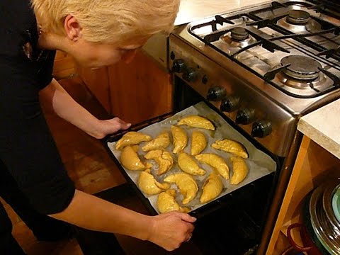 A tésztából 3 cm átmérőjű rudat formázunk, amit egy késsel félbe vágunk. majd ismét félbe, és ezt addig ismételgetjük, amíg nagyobb dió méretű tésztát nem kapunk. Ezeket gombócokká hengergetjük, oválissá nyújtjuk, 2-3 mm vastagságig.Egy kanálnyi tölteléket teszünk rájuk, és kifli formájúra feltekerjük őket, a hosszú oldaluknál kezdve.