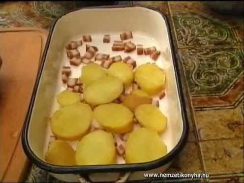 - Keményre főzzük a tojásokat,a krumplit egy másik edényben, sós vízben, héjában puhára főzzük. Karikákra szeljük a kolbászt. Meghámozzuk a megfőtt tojást,a krumplit és ezeket is felkarikázzuk. Egy magas falú tepsibe felkockázott szalonnát hintünk, betakarjuk egy réteg krumplival, egy réteg tojással, kolbásszal. Újabb réteg krumpli,szalonna, tojás kolbász,majd az utolsó réteg következik: krumpli,szalonna, tojás. Az egészet leöntjük a tejföllel és izlés szerint adhatunk hozzá 1 dl fehérbort is. Előmelegített sütőben, magas hőmérsékleten 15 percig sütjük és lekapcsolás után, további 10 percre bent hagyjuk. Ropogós héjú, kenyérrel és házi savanyúsággal kínáljuk.
