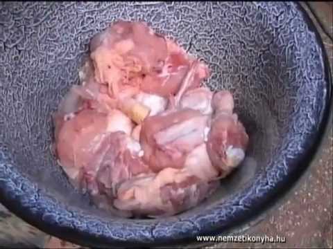- A szeletekbe vágott szalonnát belefektetjük a bogrács aljába, és ráhelyezzük, a feldarabolt húsokat. Megsózzuk és ráöntjük a felkockázott hagymákat. Felöntjük 3 dl borral, lefedjük és közepes lángon, ritka kevergetés mellett főzzük.