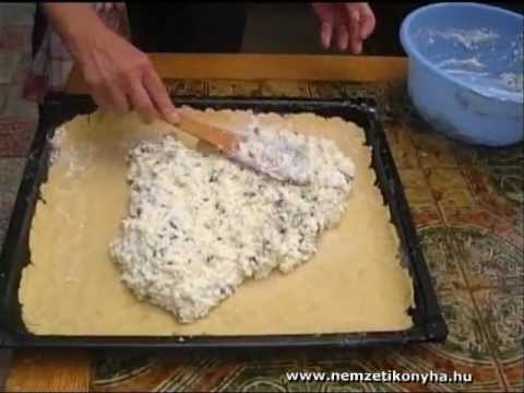 A tésztát egyharmad-kétharmad arányban elvágjuk. Lisztezett deszkán a nagyobb tésztát tepsi méretűre kinyújtjuk nyújtófára tekerjük és a kivajazott,lisztezett sütő edényünkbe helyezzük.