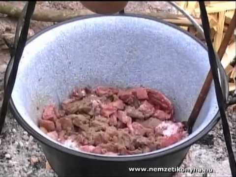 • A felkockázott szalonnákat zsírjára pirítjuk, hozzáadjuk a felkockázott húsokat, körbepirítjuk, megfűszerezzük: sóval, borssal, paprikával.